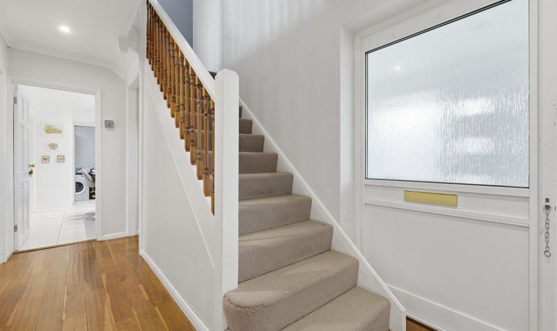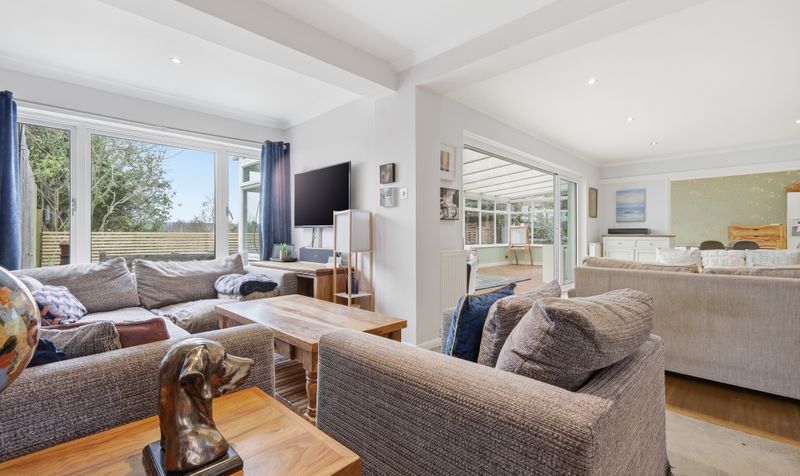 Stepping through the enclosed porch – perfect for coats, shoes and everyday essentials – the spacious entrance hall creates an immediate sense of warmth, with wooden flooring and soft neutral tones establishing the home’s calm and welcoming atmosphere. The downstairs has a largely open-plan layout that lends itself perfectly to entertaining and family living.