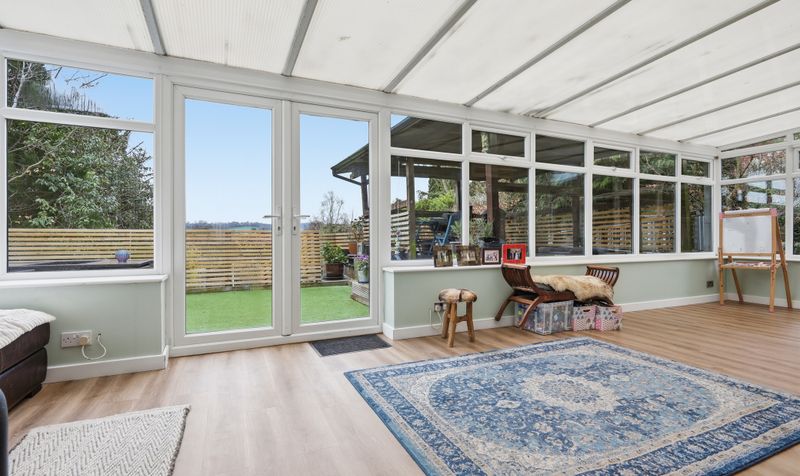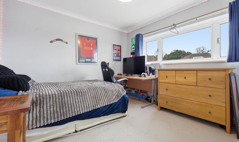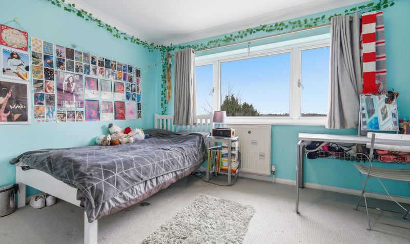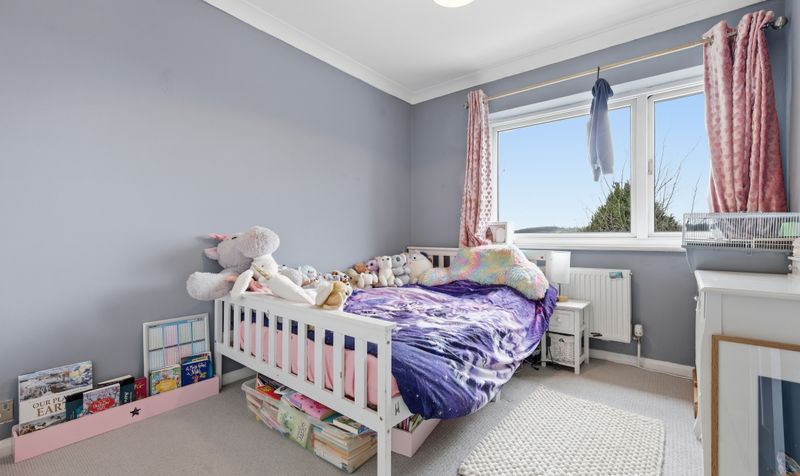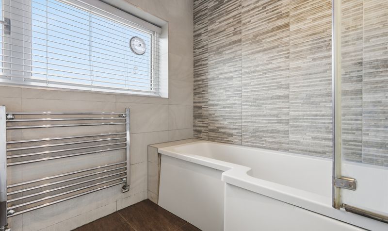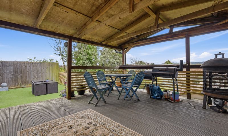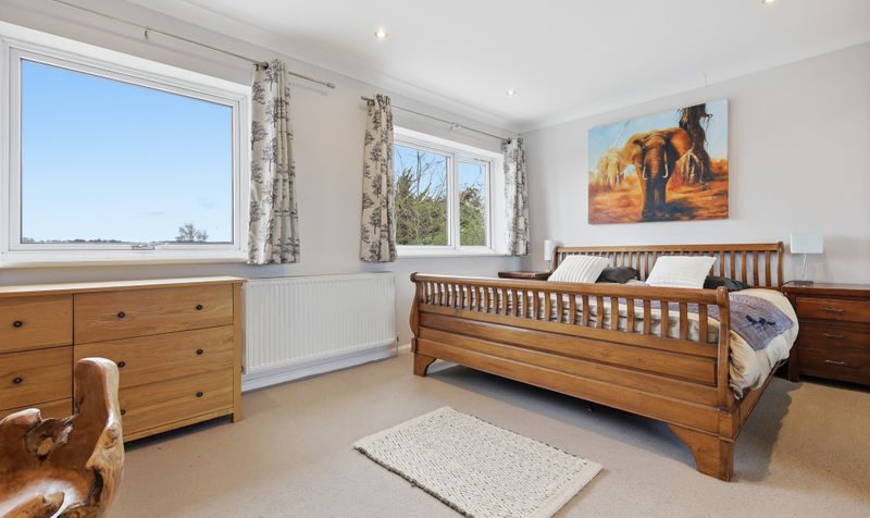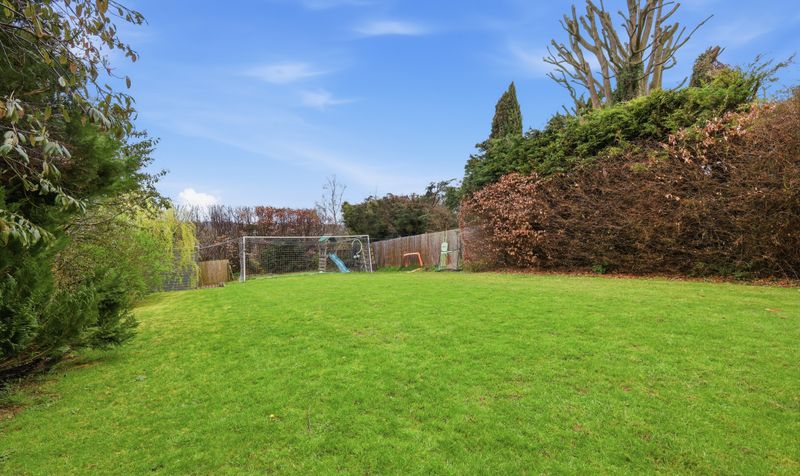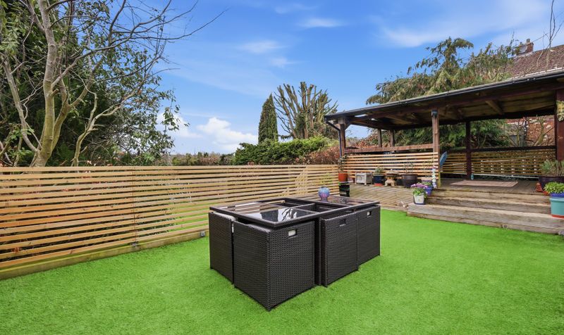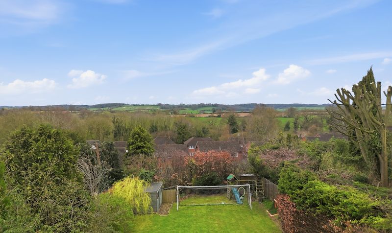 Upstairs, the property has four well-proportioned double bedrooms which benefit from large windows making them wonderfully bright and airy. The principal bedroom is of a generous size, with lovely countryside views through its double windows and large fitted mirrored wardrobes. Two of the other bedrooms also enjoy fabulous views and all three have built-in wardrobes with plenty of space for additional furniture. The family bathroom is fully tiled with marble-effect and slate-effect wall tiles. It features a white suite, including a large bath with shower over, and chrome heated towel rail. The 90’ x 50’ garden is a fantastic asset of this spacious property. South-facing and mainly laid to lawn with mature borders, it’s perfect for children to play and there’s plenty of space for some serious football practice! The raised decking area enjoys those countryside views, ample space and a covered pagoda, which is ideal for entertaining during the summer months. To the front of the property is a block-paved driveway providing parking for three vehicles.