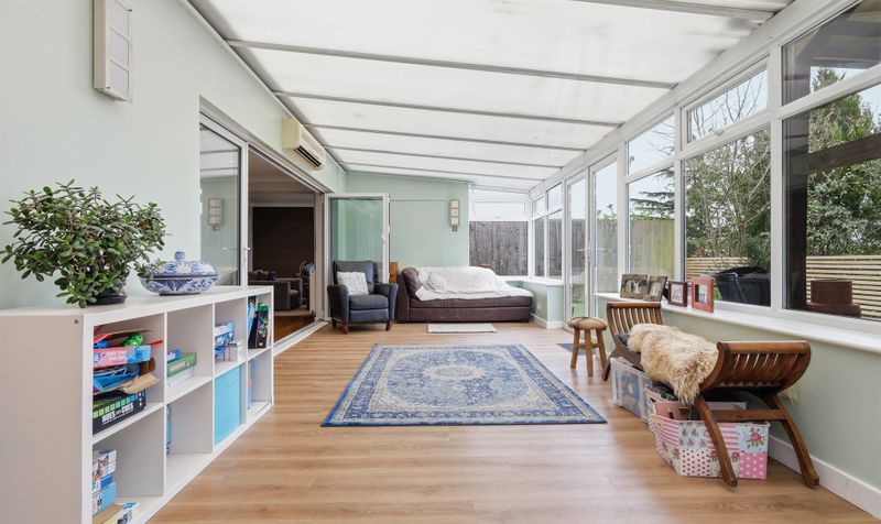 The dining area is open plan to the kitchen and has plenty of room for a large table and chairs. Glazed double doors lead out into the conservatory, introducing plenty of natural light to this already bright and airy space. It’s the perfect place to enjoy both meals with the family and entertaining guests. Continuing the sociable flow, the dining area runs semi-open plan into the sitting room, which in turn wraps around into a cosy snug. The sitting room offers a relaxed and elegant setting, with ample space for sofas and additional furniture, plus a feature fireplace with log burner – perfect for cosying up in front of on a winter’s evening.