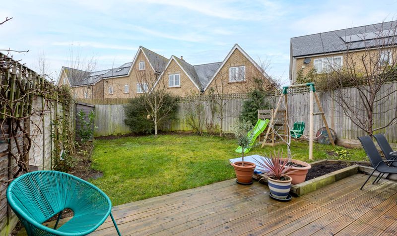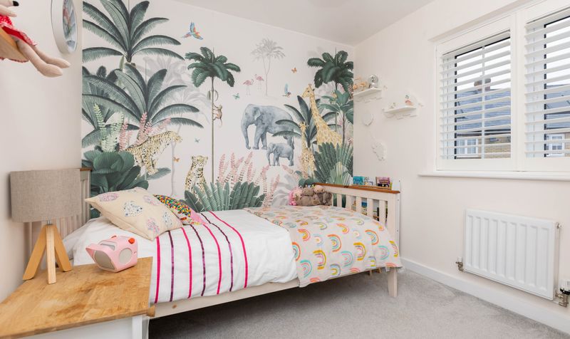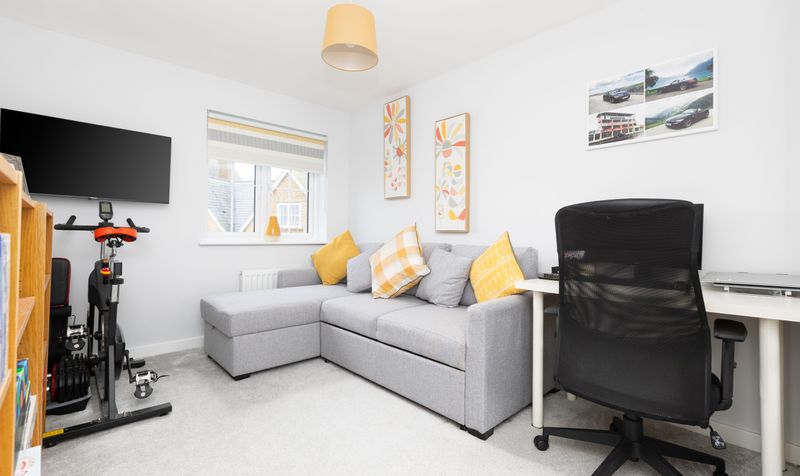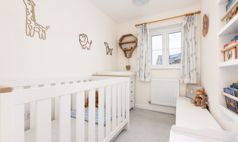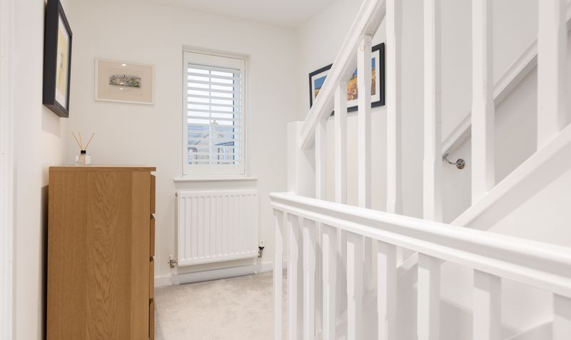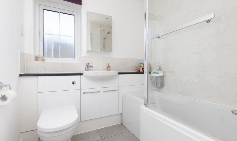 Upstairs, the first-floor landing features two useful storage cupboards and leads off to three well-proportioned bedrooms – two double bedrooms and a single room. All have crisp décor, pale grey carpets and feel light and airy. The bedroom located at the front of the house benefits from window shutters, and the single bedroom is currently being used as a nursery but would make an equally good office for working from home. The family bathroom features neutral wall tiles, contrasting grey floor tiles and a modern, white suite, including a full-size bath with shower over.