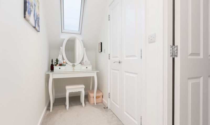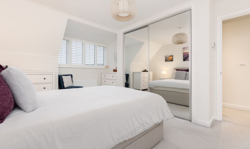 The second floor is home to the principal suite – a real retreat for relaxing after a busy day. Featuring a dressing area and walk-in wardrobe as well as fitted mirrored wardrobes, it’s a light-filled and spacious sanctuary for unwinding. Window shutters provide an attractive feature, and the room benefits from its own ensuite shower room with marble-effect tiling, contemporary white bathroom suite, vanity unit and heated towel radiator. The property benefits from modern remote-controlled roller doors and solar panels.