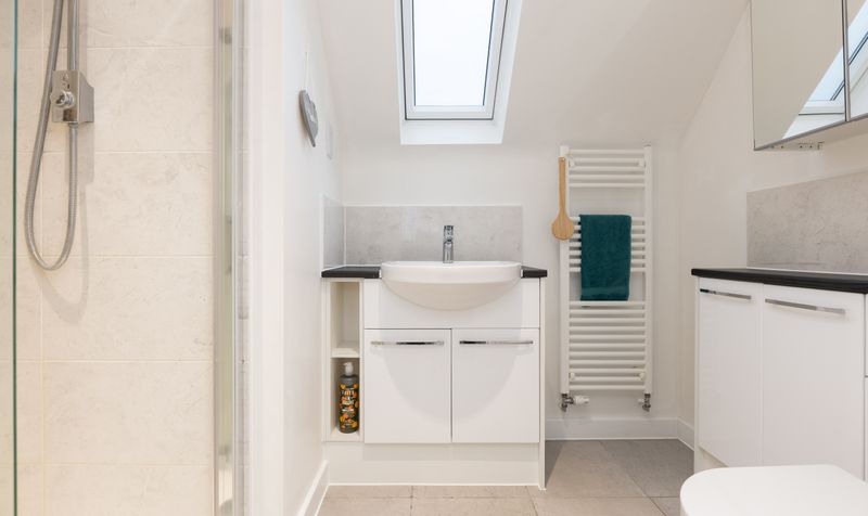Beyond the sitting room is a spacious kitchen/dining room. This is the real heart of the home and features sleek white cabinetry with silver fittings and contrasting black worktops. The white tiled floor complements the units and enhances the feeling of space and light in the room. Integrated appliances include a double wall-mounted electric oven, gas hob with wall-mounted stainless-steel hood, dishwasher, a washing machine and fridge-freezer. It’s a practical kitchen with plenty of storage and prep space, plus ample room for a dining table and chairs – ideal for enjoying meals with family and friends. French doors and full-height windows introduce plenty of natural light, and provide direct access to the decking outside, making it a great option for indoor-outdoor living and particularly hosting summer barbecues. Whether you're relaxing with family or entertaining guests, this room provides the perfect setting. Completing the downstairs is a cloakroom with a modern white suite.