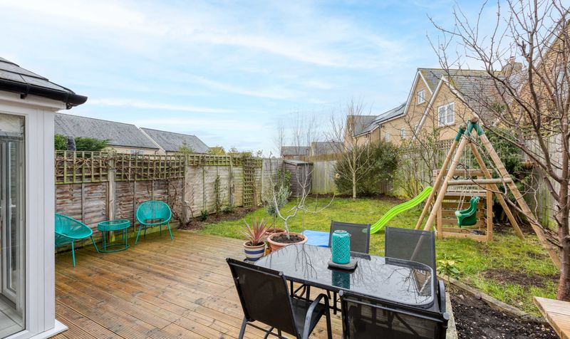 Outside, the south-west facing garden has been nicely landscaped and features a decked area as well as a lawn. It’s a great space for enjoying the outdoors and for children to play. To the side of the house is a block-paved driveway with a double garage which has boarded loft storage. The front garden features a paved path and small lawned area.