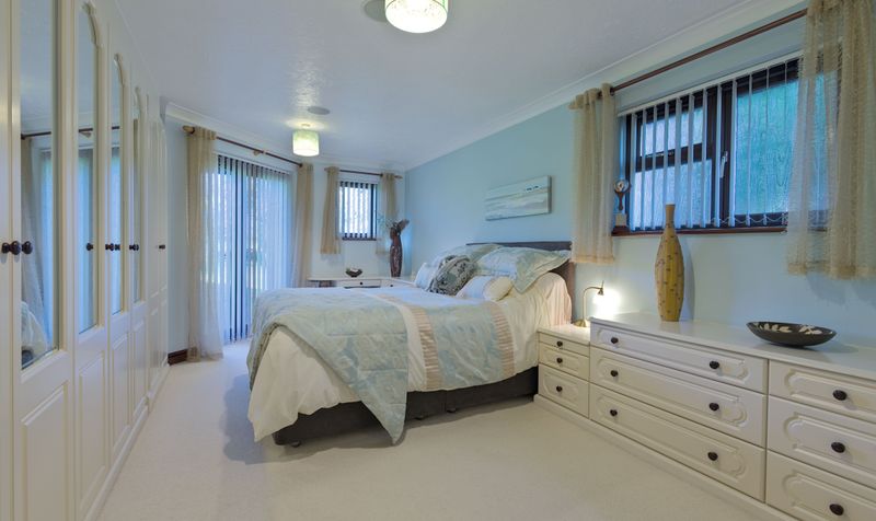 Leading on from the conservatory is one of the property’s five bedrooms. Benefiting from its own ensuite shower room, this is another extremely versatile space which can also be accessed via the entrance hall. Possible alternative uses include a playroom or studio space. Three further large and well-proportioned bedrooms are located to the rear of the property. All have fitted wardrobes, providing ample storage space, as well as French doors leading out to the patio and extensive grounds beyond. It’s easy to imagine waking up on a summer morning and stepping out on to the patio to enjoy the early morning sunshine – a glorious start to anyone’s day. The principal bedroom has its own fully tiled ensuite shower room, featuring a crisp white colour scheme and a modern white suite. The spacious family bathroom features a corner bath and separate shower cubicle. A utility room with outside access completes the downstairs – an indispensable addition for any busy family.