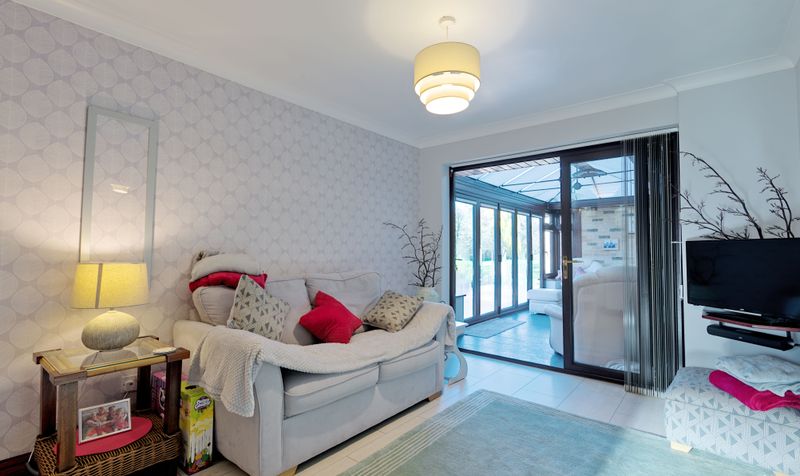Set back from the road down a spacious, block-paved driveway, the property creates an appealing first impression. As you enter via the entrance hall and step into the sitting room, you immediately get a sense of the incredible amount of space this house has to offer. Decorated in a neutral colour palette and with practical, tiled flooring, the sitting room is a lovely bright room, thanks to multiple windows which introduce plenty of natural light. A double aspect fireplace set into a brick wall provides a focal point as well as a wonderful opportunity for cosy nights in front of the fire. With plenty of room for comfy sofas and other furniture, it’s a great room for relaxing after a busy day and spending time with loved ones.