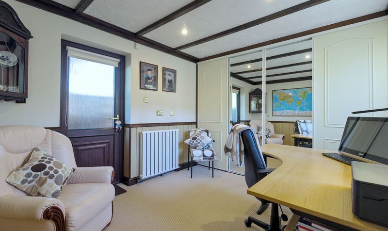 Adjacent to the sitting room is a second reception room which also benefits from the dual aspect fireplace. Featuring an adjoining bar area, this versatile and bright room is perfect for entertaining and makes a fantastic snug, with the bar as a possible games area. The feature fireplace is a fantastic asset during the winter months, providing the perfect setting for cosy evenings in. A glazed door introduces additional light and leads to the garden via a lobby. Next to the snug is another versatile and well-proportioned room, also with outside access. Currently used as a spacious home office, it would make an equally good bedroom, or even a craft or hobbies room.