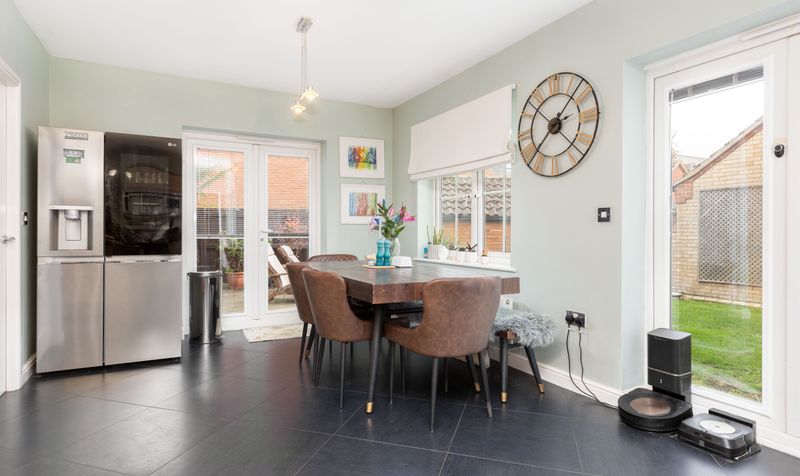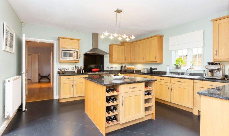 Overlooking the garden is a stunning, triple-aspect kitchen/breakfast room. This is the heart of the house and the perfect space for family living and informal entertaining. The kitchen is contemporary in style, with wooden Shaker-style cabinetry, contrasting granite worktops and stylish black floor tiles. The duck-egg walls introduce a subtle splash of colour, and the integrated appliances include a range cooker, dishwasher and microwave oven. There’s plenty of space for an American-style fridge-freezer plus a table and chairs. It’s the perfect kitchen for keen chefs with ample storage space, including a separate pantry. The central kitchen island provides the perfect spot for enjoying your first freshly brewed coffee of the day (or well-deserved glass of wine in the evening) and includes integrated wine racks and a feature pendant light. Two sets of French doors lead to the garden, making this a beautifully light-filled room, as well as being perfectly set up for hosting summer gatherings with family and friends. Leading off from the kitchen is a practical utility with outside access (indispensable if you are ever dealing with a muddy dog and/or children!)