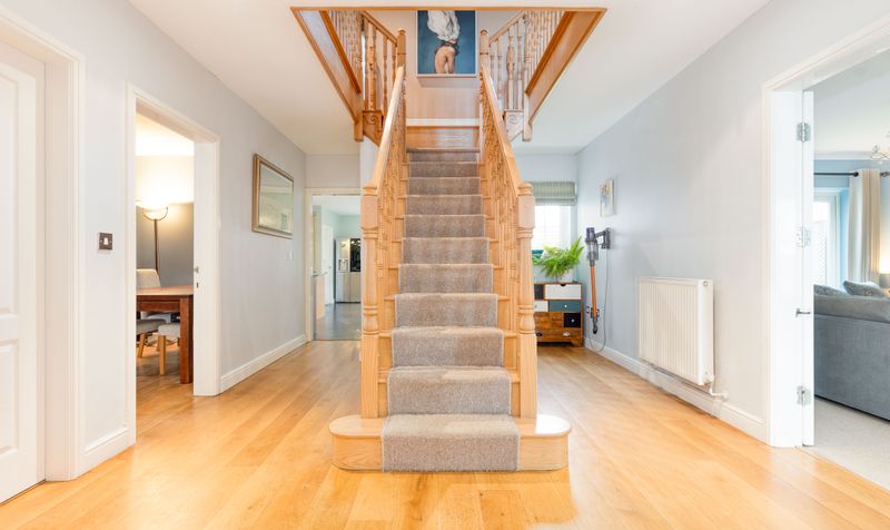 As you enter the property, a spacious porch with handy storage opens into a stunning entrance hall with central staircase. The warm wooden flooring sets a tone of quiet luxury, and the beautiful finishes set a high bar for the rest of this fantastic house.