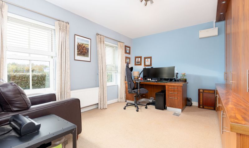 Located next to the kitchen is a spacious and versatile family room. This is a wonderfully versatile space, ideal for relaxing together or entertaining guests, with plenty of space for comfortable seating. It could just as easily be transformed into an elegant dining room - the perfect setting for hosting dinner parties or enjoying family meals. The current owners use it as a TV room. A similarly sized study is located adjacent to the dining room. Again, this is a very versatile room which enjoys plenty of daylight thanks to its double windows. There is lots of space, plus beautifully crafted bespoke wooden cabinetry which runs across one wall, providing ample and stylish storage. Completing the downstairs is a handy cloakroom featuring a modern white suite.